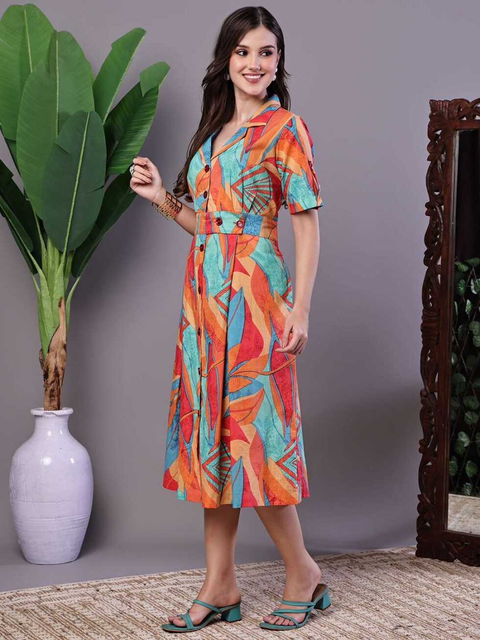 Women’s Tropical Print Button-Down Cotton Midi Dress